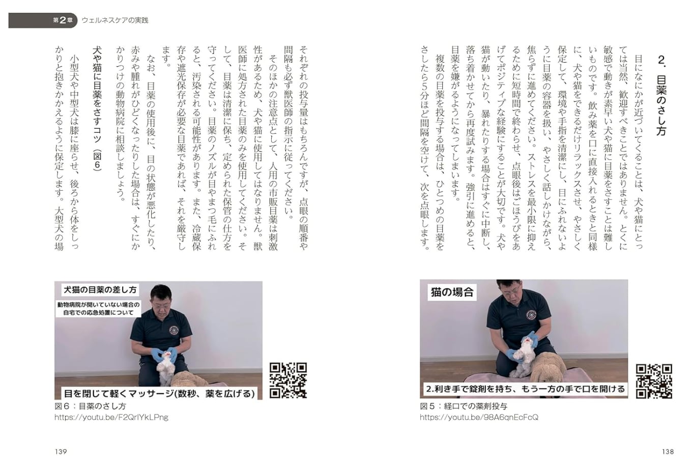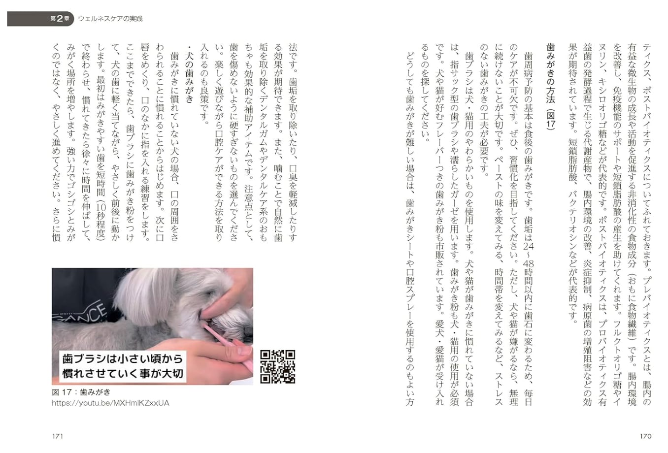 ●ウェルネスケアの実践編として、生活環境と食事・栄養管理、ストレス管理、グルーミング(シャンプーや歯みがきなどの日常のケア)などについて、具体的な方法と注意点を紹介。飲み薬や目薬の投薬法、ブラッシング、シャンプー、ドライヤー、爪切り、肛門腺絞り、耳掃除、歯みがきなどについては、動画でわかりやすく解説。